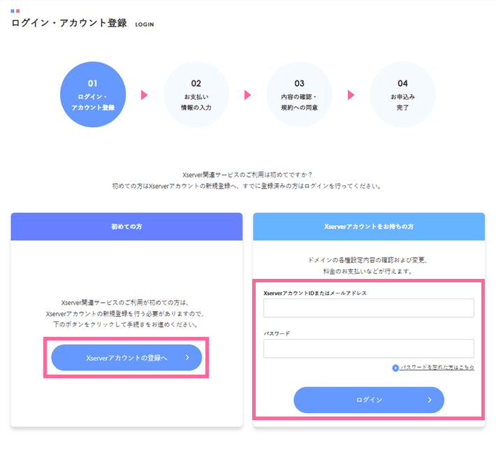 すると、XServerアカウントへのログイン・登録画面が表示されます。