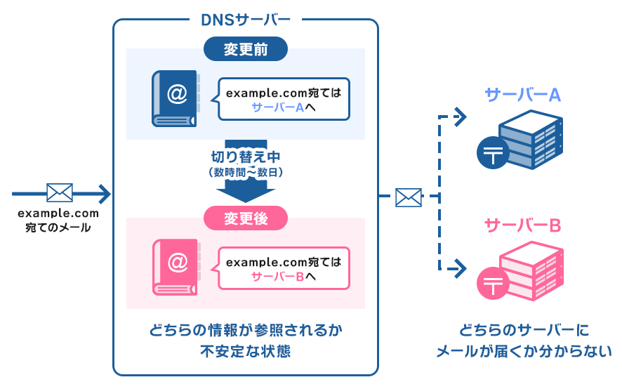 その間は、メールが「新旧どちらのサーバーに届くか分からない不安定な状態」です。