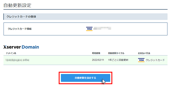 クレジットカード情報や、設定ご希望のサーバー・ドメインの内容に誤りがないか確認いただき、「自動更新を設定する」をクリックしてください。